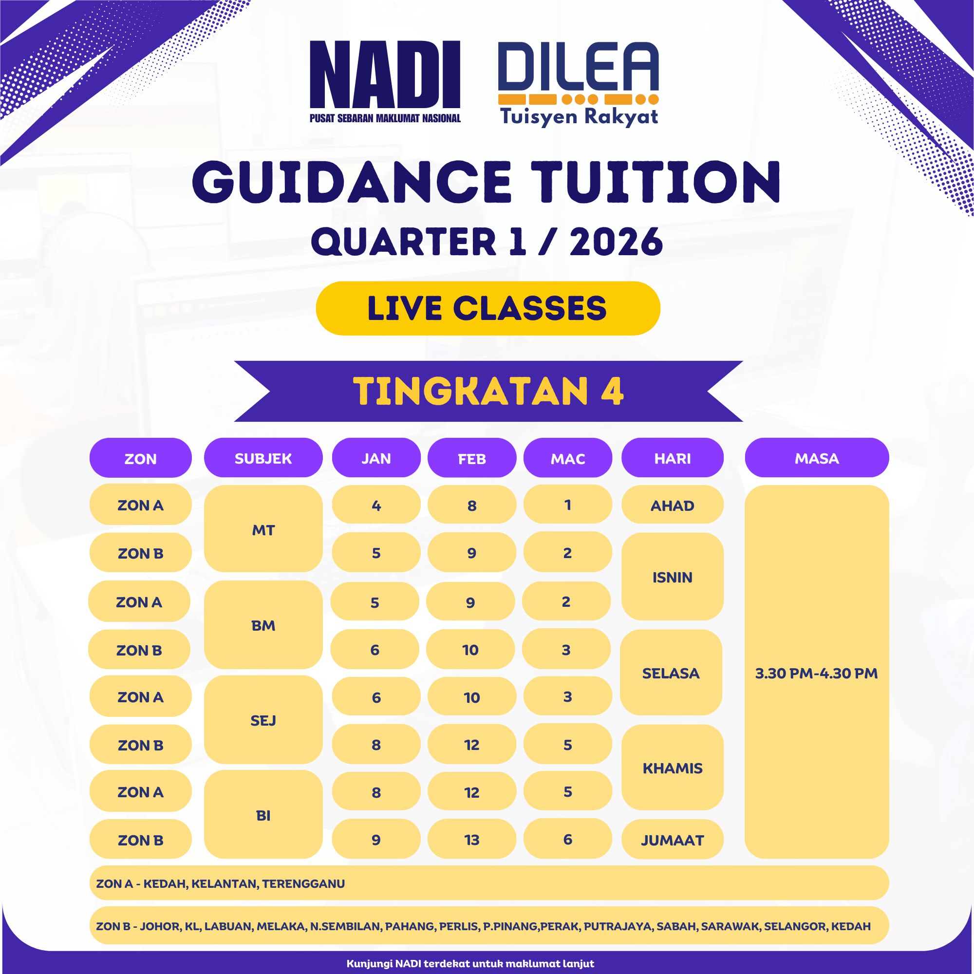 Program Cuti Sekolah @ NADI TARIKH : 22 – 30 DISEMBER 2025 MASA : 9.00 am – 5.00 pm LOKASI : NADI Taman Kesedar Jaya PESERTA : 60 orang KELAS : Cuti Sekolah Tujuan Memberi peluang kepada kanak-kanak dan pelajar […]